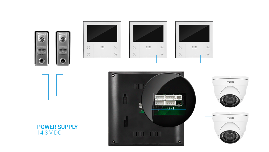 Povežite do štiri monitorje, dve zunanji enoti, dve CCTV kameri ali eno zunanjo enoto ter tri CCTV kamere.