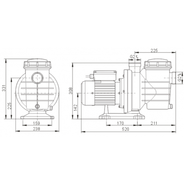 Za bazene do 90 m3 + 1500W + 2.0 KM + pred filter + max. pretok 470 l/m (27 m3/h)