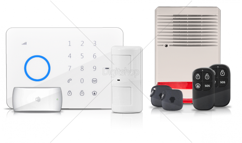 GSM/SMS ALARMNA CENTRALA + RELE IZHOD + RFID ČITALEC KARTIC/KLJUČKOV + PIR SENZOR + MAGNETNI SENZOR + 2 X DALJINSKI UPRAVLJALNIK + NOTRANJA SIRENA