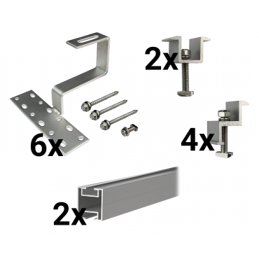Nosilna konstrukcija za 2 solarna panela: 6x strešni nosilec, 2x aluminijast profil, 4x končni nosilec za module, 2x sredinski nosilec