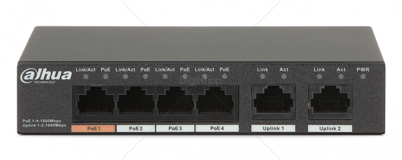 Ethernet port: 1-4:4 × RJ45 10/100/1000 Mbps (PoE); 5-6:2 × RJ45 10/100/1000 Mbps (uplink)