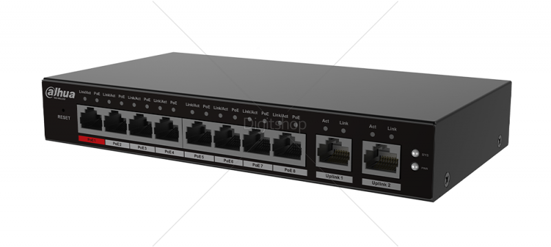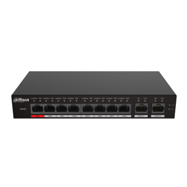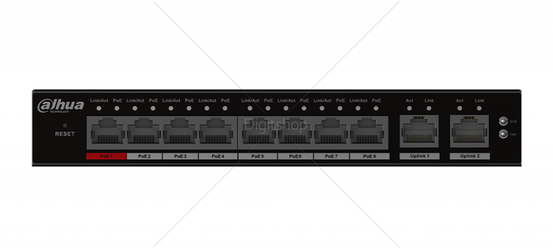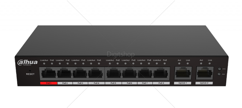 PoE moč: Vrata 1–8: 8 × RJ-45 10/100 M; Uplink 1–2: 2 × RJ-45 10/100/1000 M