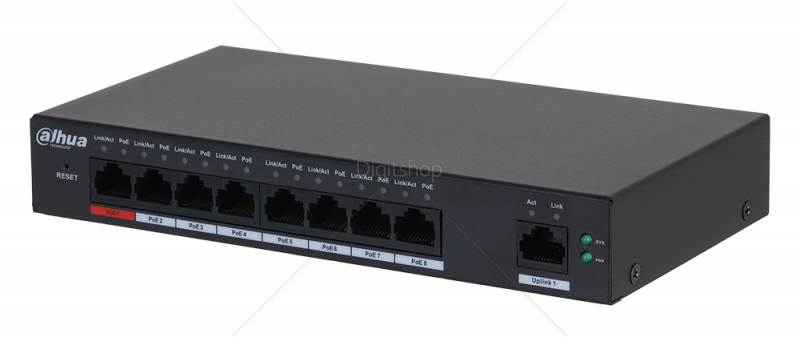 PoE moč: Vrata 1–8: 4 × RJ-45 10/100/1000 Mbps; Uplink 1: 1 × RJ-45 10/100/1000 Mbps