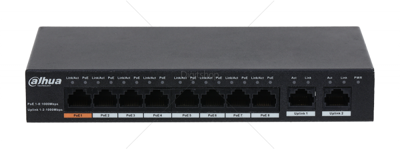 Ethernet priklučki: 8x 10/100 / 1000Mbps Base-TX PoE Ethernet vrata; 2x 10/100 / 1000Mbps Ethernet vrata Base-TX