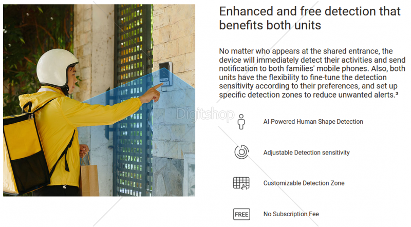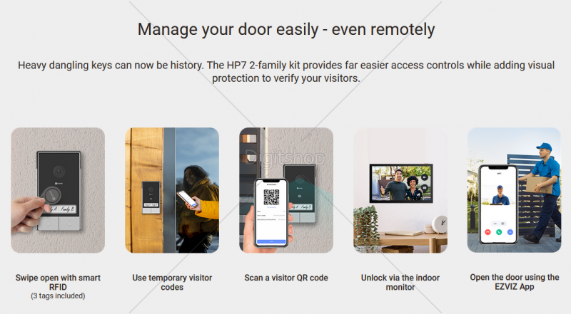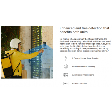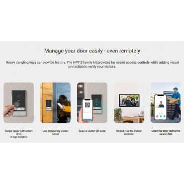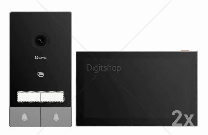 EZVIZ HP7 2-Family Kit je napreden video domofonski sistem, zasnovan za dve družini, ki si delita glavni vhod. Sestavljen je iz zunanje enote z dvema ločenima gumboma in dveh notranjih 7-palčnih zaslonov na dotik, kar omogoča vsaki družini neodvisno upravljanje dostopa do doma. Sistem podpira 2K video ločljivost, dvosmerno komunikacijo, pametno zaznavanje gibanja in daljinsko odklepanje vrat preko aplikacije EZVIZ. Poleg tega omogoča odklepanje z RFID obeski (3 za vsako družino), ima nočni vid, vremensko odporno zasnovo in podpira Wi-Fi povezljivost ter shranjevanje posnetkov na microSD kartico ali v oblak EZVIZ CloudPlay. Idealna rešitev za varno in pametno upravljanje skupnega vhoda.