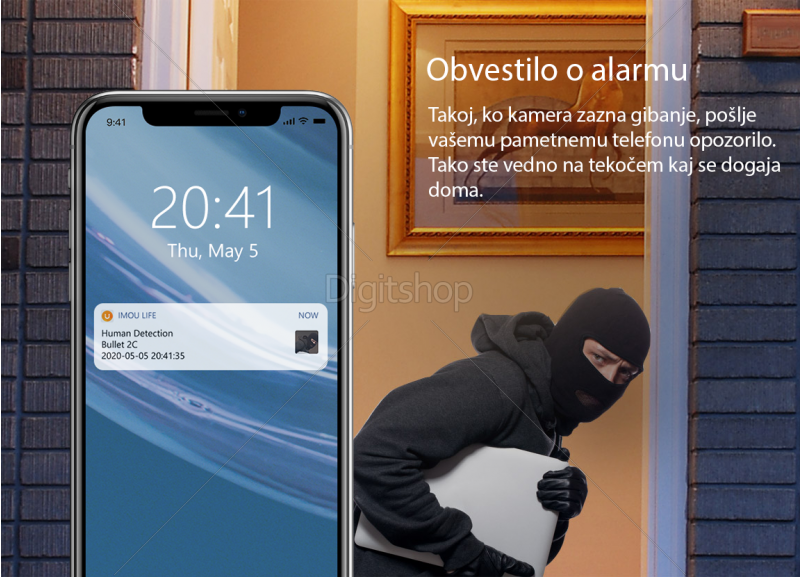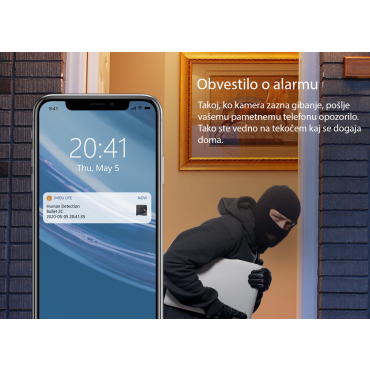 - Omogoča zaznavanje gibanja in zazanavanje ljudi. Ta funkcija omogoča shranjevanje posnetkov na mikro SD kartico za daljše obdobje. Preko aplikacije si lahko ogledate posnetke v živo ter arhiv posnetkov. Posnetke lahko shranite kar na vaš telefon.