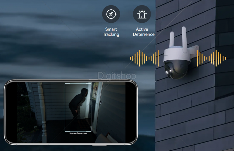2MP (1920 x 1080) možnost snemanja na SD / Leča 88° / Nočni domet do 20m / Vgrajen mikrofon in zvočnik - dvosmerni zvok / Zaznavanje gibanja, odkrivanje ljudi, nastavljivo območje / Aktivno odvračanje / Brezplačna aplikacija za telefon