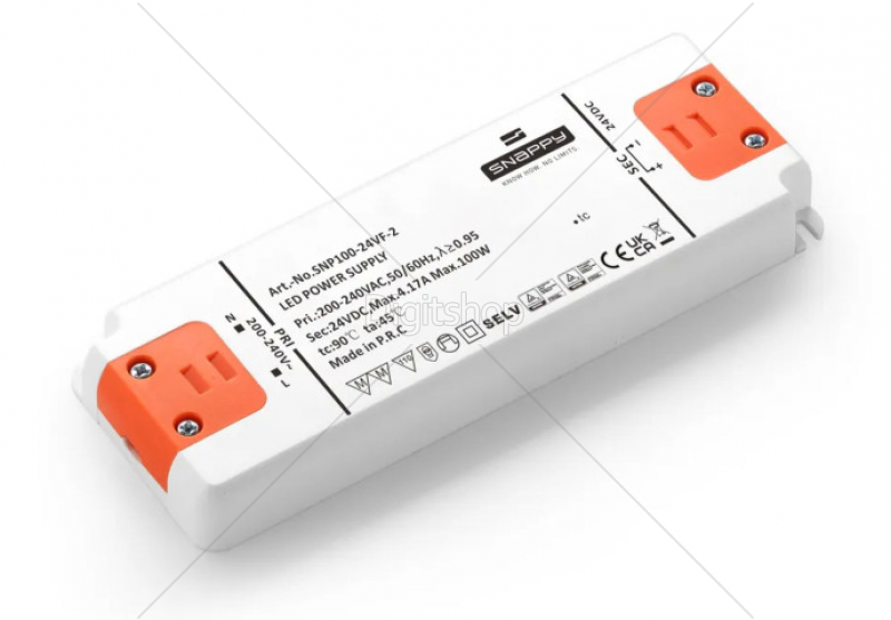 Napajalnik SS100-24VF proizvajalca Snappy, je namenjen predvsem napajanju LED trakov, LED žarnic, LED sijalk, LED modulov in ostalih LED svetil, ki za delovanje potrebujejo napajanje s konstantno napetostjo. Snappy kompaktni napajalniki za LED so zaradi oblike in kompaktnih dimenzij primerni za vgradnjo v najrazličnejša ohišja, kjer je pomanjkanje prostora. Zaradi ustreznosti varnostnim standardom jih lahko montiramo tudi neposredno na leseno pohištvo in druge vnetljive materiale.