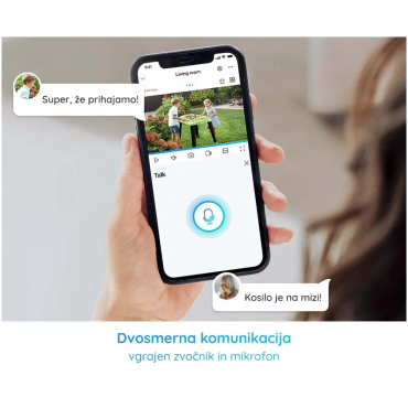 Vgrajen mikrofon in zvočnik omogočata, da poslušate in se pogovarjate s tistim, ki ga kamera ujame, v realnem času! Uporabna funkcija, ko vas ni doma, ali ne veste, kdo stoji pred vrati.
