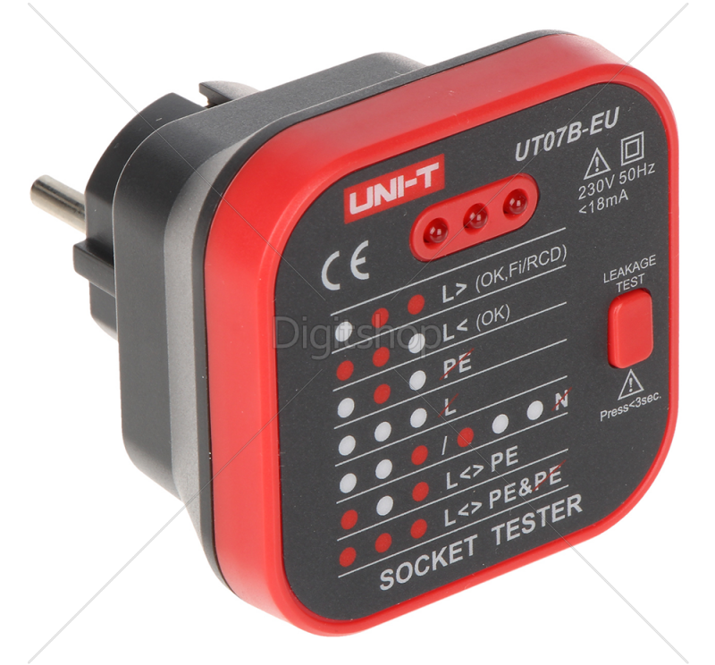 Izbrane značilnosti: Test RCD (test diferenčno-tokovne naprave): ~ 30 mA; Preizkus položaja faznega voda; Signaliziranje dejstva, da ni ozemljitve; Signaliziranje dejstva, da ni faze; Signaliziranje dejstva, da ni nevtralne žice; Signaliziranje dejstva, da sta bili zamenjani mesti faze in ozemljitve; Signaliziranje dejstva, da sta bili zamenjani mesti faze in ozemljitve ter da ni ozemljitve