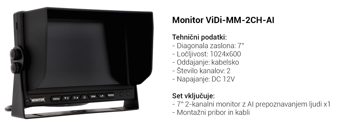 OPOMBA: Za pravilno delovanje kompleta ViDi-MM-2CH-AI je potrebno posebej kupiti kamero: ViDi-MM-KAM1-AI / ViDi-MM-KAM2-AI . Kamere niso priložene monitorju. Monitor bo podpiral največ dve žični kameri. Kompletu je možno dodati optično-akustično sireno ViDi-MM-GLO. Monitor nima funkcije snemanja.