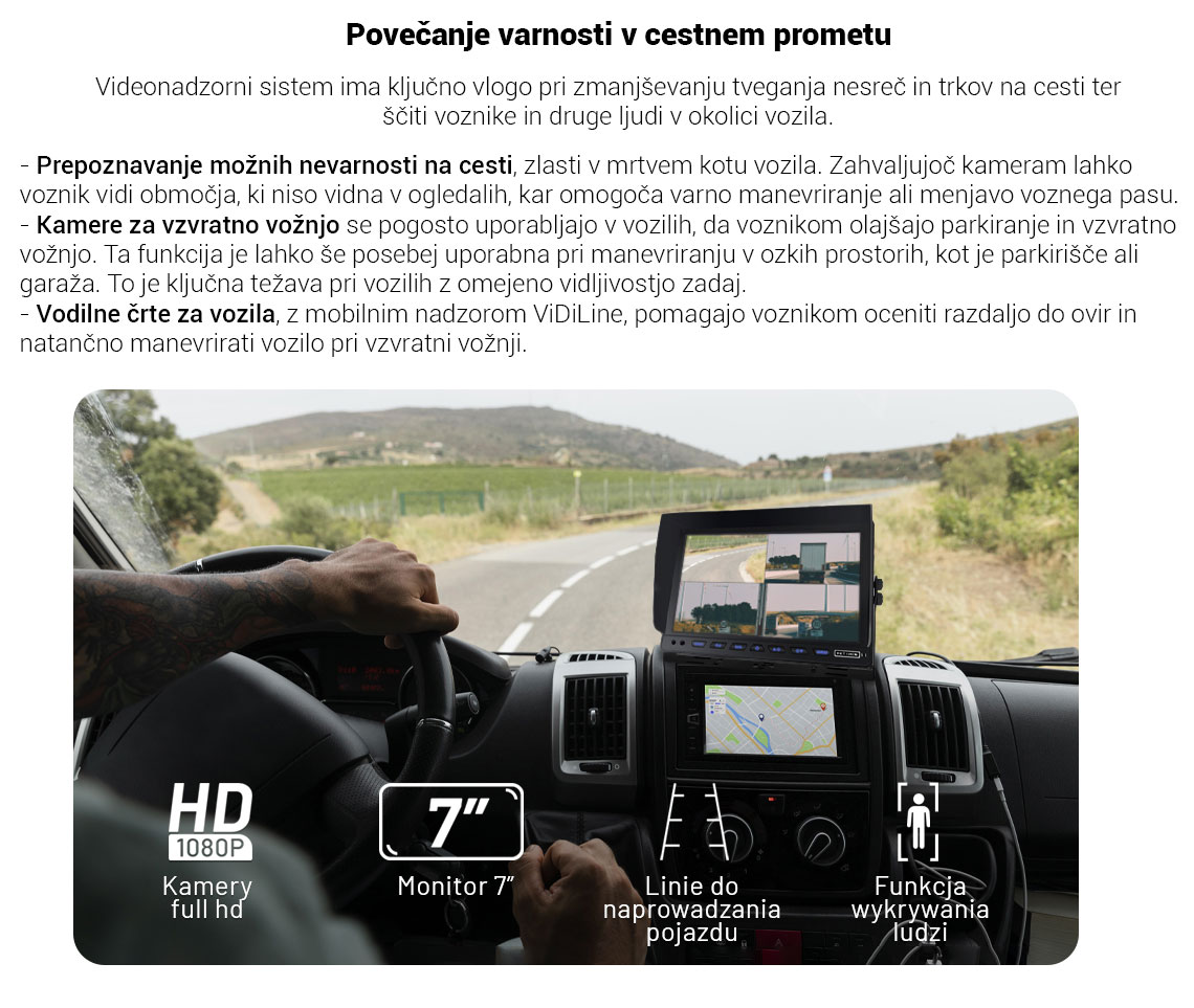 Videonadzorni sistem ima ključno vlogo pri zmanjševanju tveganja nesreč in trkov na cesti ter ščiti voznike in druge ljudi v okolici vozila.