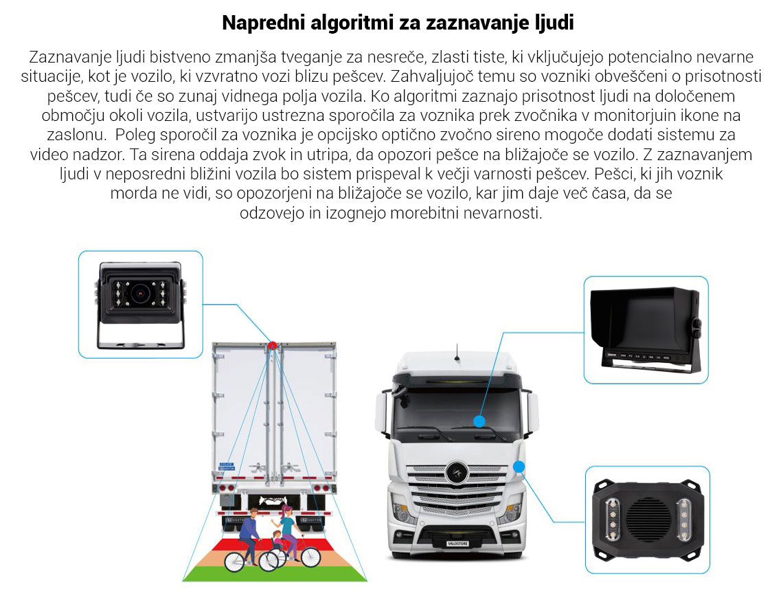 Zaznavanje ljudi bistveno zmanjša tveganje za nesreče, zlasti tiste, ki vključujejo potencialno nevarne situacije, kot je vozilo, ki vzvratno vozi blizu pešcev. Zahvaljujoč temu so vozniki obveščeni o prisotnosti pešcev, tudi če so zunaj vidnega polja vozila. Ko algoritmi zaznajo prisotnost ljudi na določenem območju okoli vozila, ustvarijo ustrezna sporočila za voznika prek zvočnika v monitorju in ikone na zaslonu. Poleg sporočil za voznika je opcijsko optično zvočno sireno mogoče dodati sistemu za video nadzor. Ta sirena oddaja zvok in utripa, da opozori pešce na bližajoče se vozilo. Z zaznavanjem ljudi v neposredni bližini vozila bo sistem prispeval k večji varnosti pešcev. Pešci, ki jih voznik morda ne vidi, so opozorjeni na bližajoče se vozilo, kar jim daje več časa, da se odzovejo in izognejo morebitni nevarnosti.