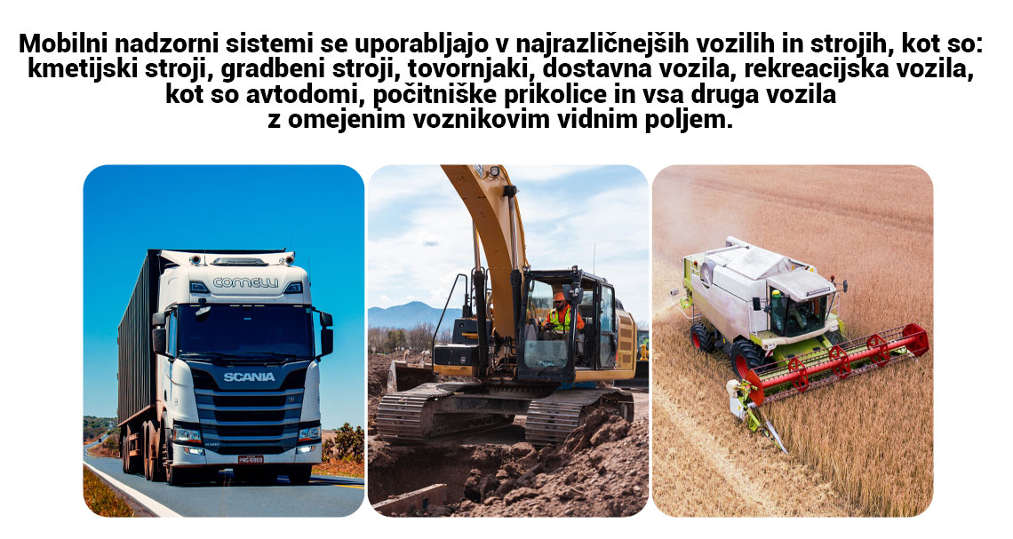 Mobilni nadzorni sistemi se uporabljajo v najrazličnejših vozilih in strojih, kot so: kmetijski stroji, gradbeni stroji, tovornjaki, dostavna vozila, rekreacijska vozila, kot so avtodomi, počitniške prikolice in vsa druga vozila z omejenim voznikovim vidnim poljem.