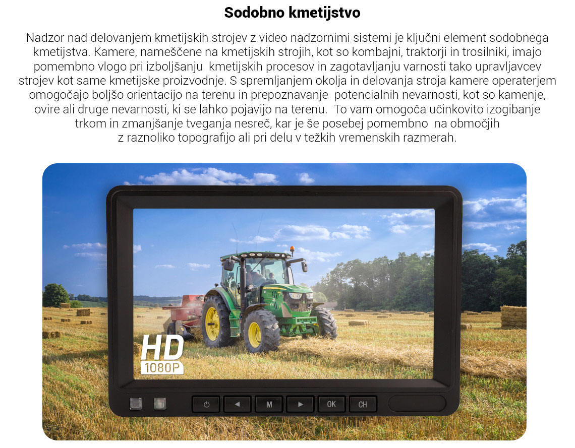 Nadzor nad delovanjem kmetijskih strojev z video nadzornimi sistemi je ključni element sodobnega kmetijstva. Kamere, nameščene na kmetijskih strojih, kot so kombajni, traktorji in trosilniki, imajo pomembno vlogo pri izboljšanju kmetijskih procesov in zagotavljanju varnosti tako upravljavcev strojev kot same kmetijske proizvodnje. S spremljanjem okolja in delovanja stroja kamere operaterjem omogočajo boljšo orientacijo na terenu in prepoznavanje potencialnih nevarnosti, kot so kamenje, ovire ali druge nevarnosti, ki se lahko pojavijo na terenu. To vam omogoča učinkovito izogibanje trkom in zmanjšanje tveganja nesreč, kar je še posebej pomembno na območjih z raznoliko topografijo ali pri delu v težkih vremenskih razmerah.