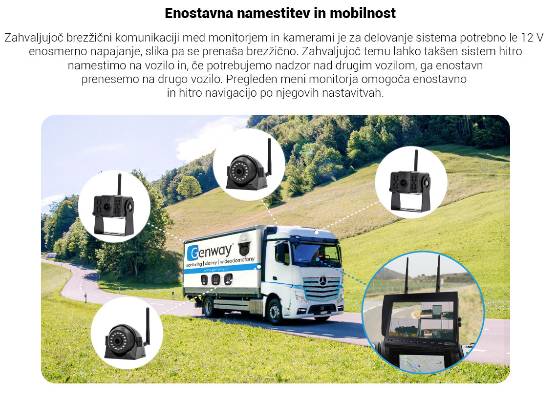 Zahvaljujoč brezžični komunikaciji med monitorjem in kamerami je za delovanje sistema potrebno le 12 V enosmerno napajanje, slika pa se prenaša brezžično. Zahvaljujoč temu lahko takšen sistem hitro namestimo na vozilo in, če potrebujemo nadzor nad drugim vozilom, ga enostavno prenesemo na drugo vozilo. Pregleden meni monitorja omogoča enostavno in hitro navigacijo po njegovih nastavitvah.