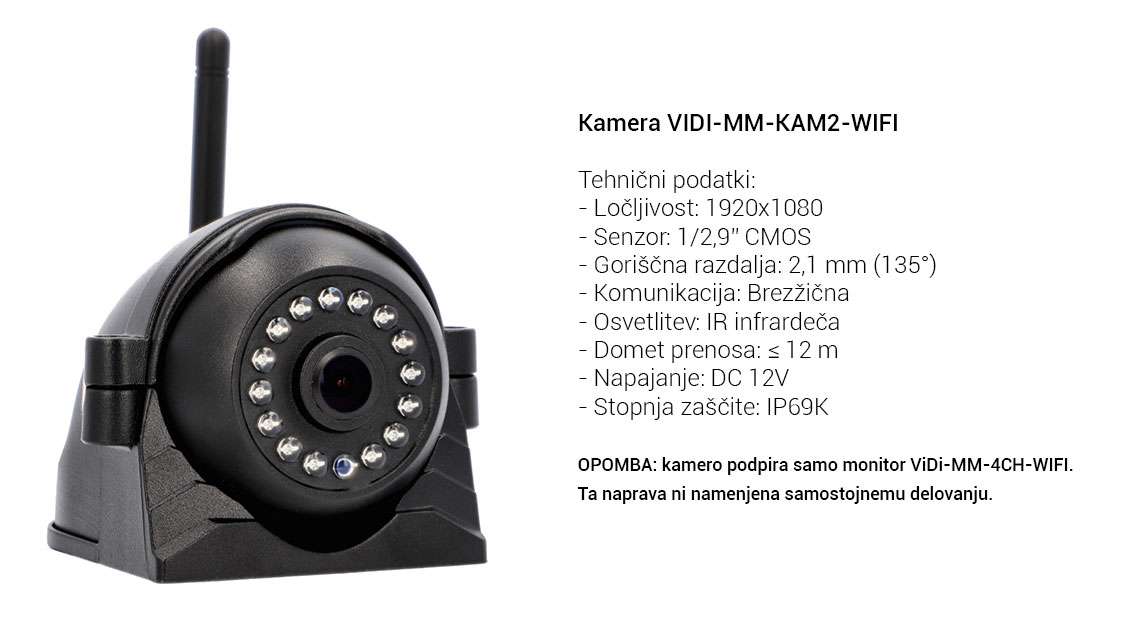 OPOMBA: kamero podpira samo monitor ViDi-MM-4CH-WIFI. Ta naprava ni namenjena samostojnemu delovanju.