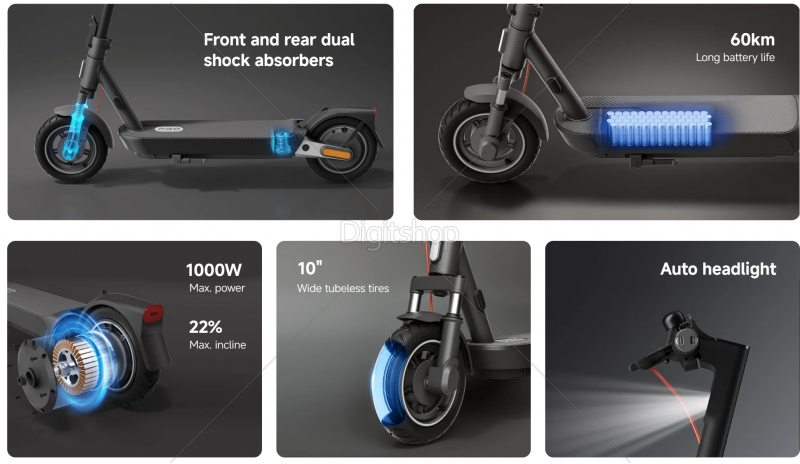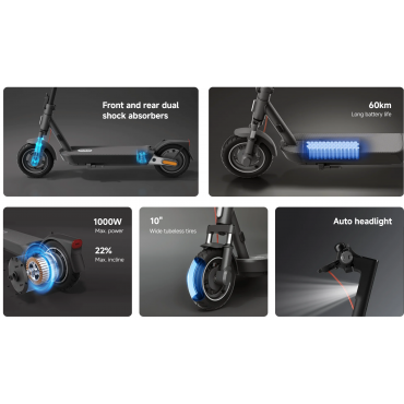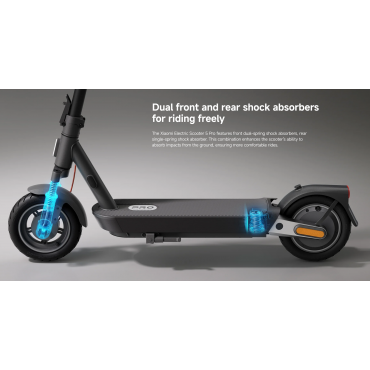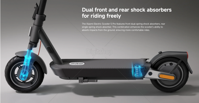 Xiaomi Electric Scooter 5 Pro električni skiro je opremljen z dvojnimi sprednjimi vzmetmi in eno zadnjo vzmetjo, kar učinkovito absorbira udarce s tal za gladko vožnjo na različnih podlagah. 10-palčne 60 mm široke pnevmatike brez zračnic zagotavljajo izjemno absorpcijo tresljajev, močan oprijem pri zavijanju in varno stabilnost na cesti.